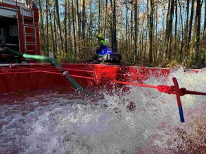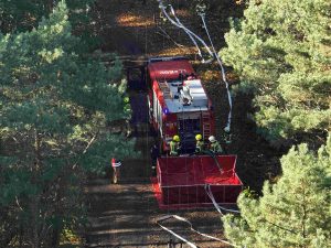 - Pożar lasu, który się rozprzestrzenia – z uwagi na awarię sieci hydrantowej woda do celów gaśniczych czerpana była z pobliskiego jeziora Piaseczno a następnie przepompowywana i przetłaczana do miejsca pożaru. Dodatkowo rozmieszczono manekiny i pozorantów w celu przeprowadzenia działań z zakresu ratownictwa medycznego.